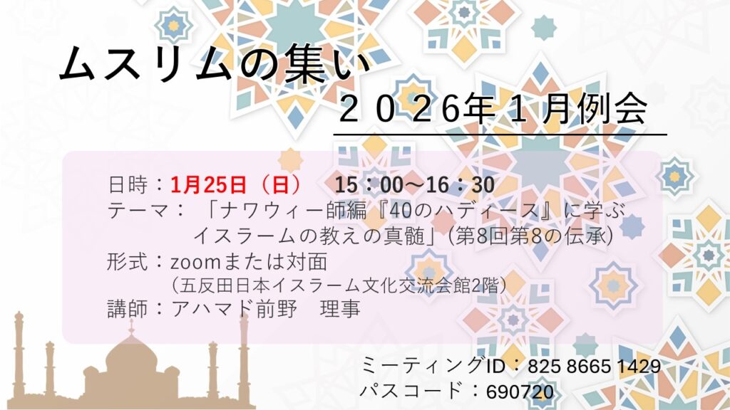 2026年1月の「ムスリムの集い」につき、以下の通りご案内いたします。