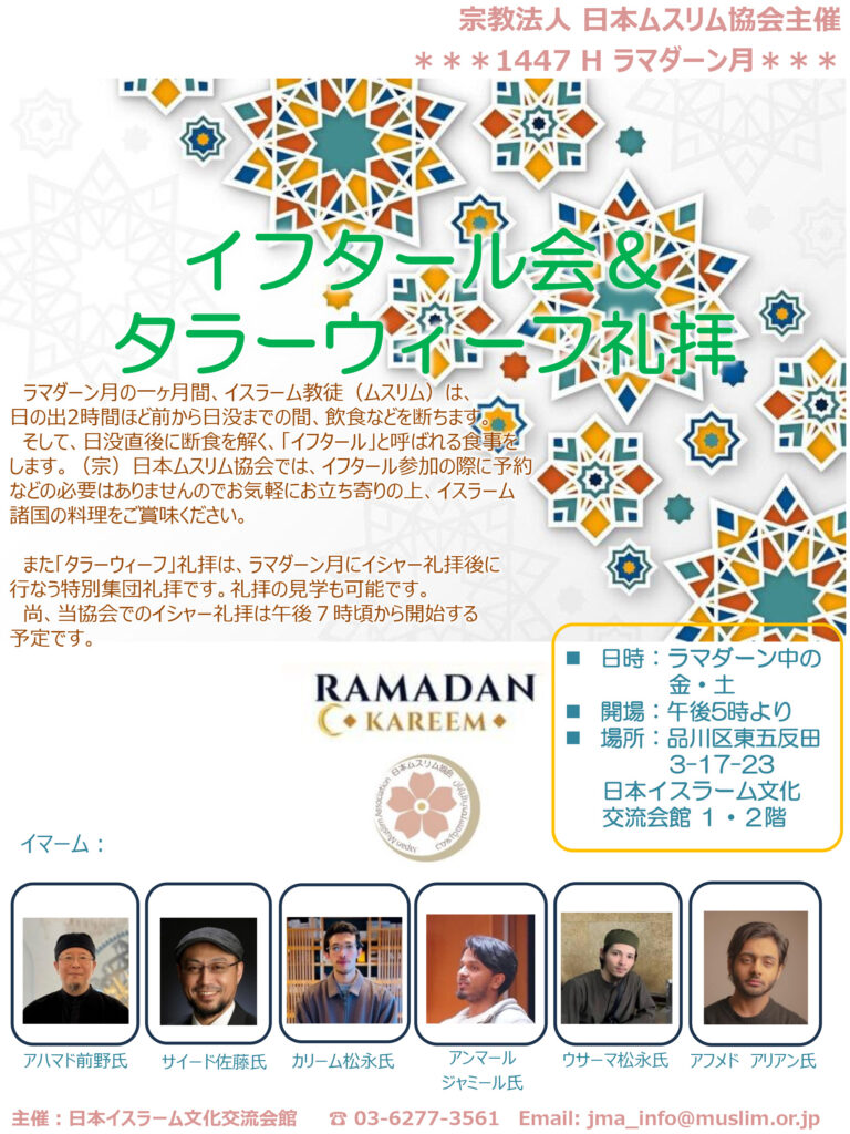 ラマダーン月の金、土曜日にタラーウィーフ(ラマダーン月の特別集団礼拝)を開始いたします。また、イフタールの食事もご用意しております。